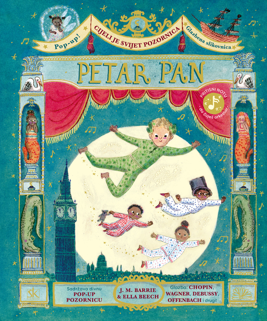 Svim zaljubljenicima u glazbu, književnost i kazalište preporučujemo svevremenu priču "Petar Pan" o najpoznatijem dječaku koji nije htio odrasti. Uz prekrasne ilustracije na svakoj se stranici nalazi simbol note koji djeca mogu pritisnuti i poslušati ulomke klasične glazbe koja prati pustolovine iz Nigdjezemske. Tu raskošnu, interaktivnu glazbenu slikovnicu za najmlađe čitatelje s divnom pop-up kazališnom pozornicom napisala je i ilustrirala Ella Beech prema izvornom djelu škotskog romanopisca Jamesa Matthewa Barrieja. Priču je preveo Mate Maras.